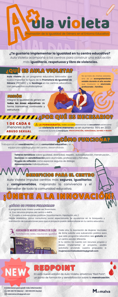 Aula Violeta es un proyecto impulsado desde MdeMalva, desarrollado junto a la comunidad educativa y las asociaciones locales, con el objetivo de construir espacios escolares más igualitarios, seguros y comprometidos con el buen trato.